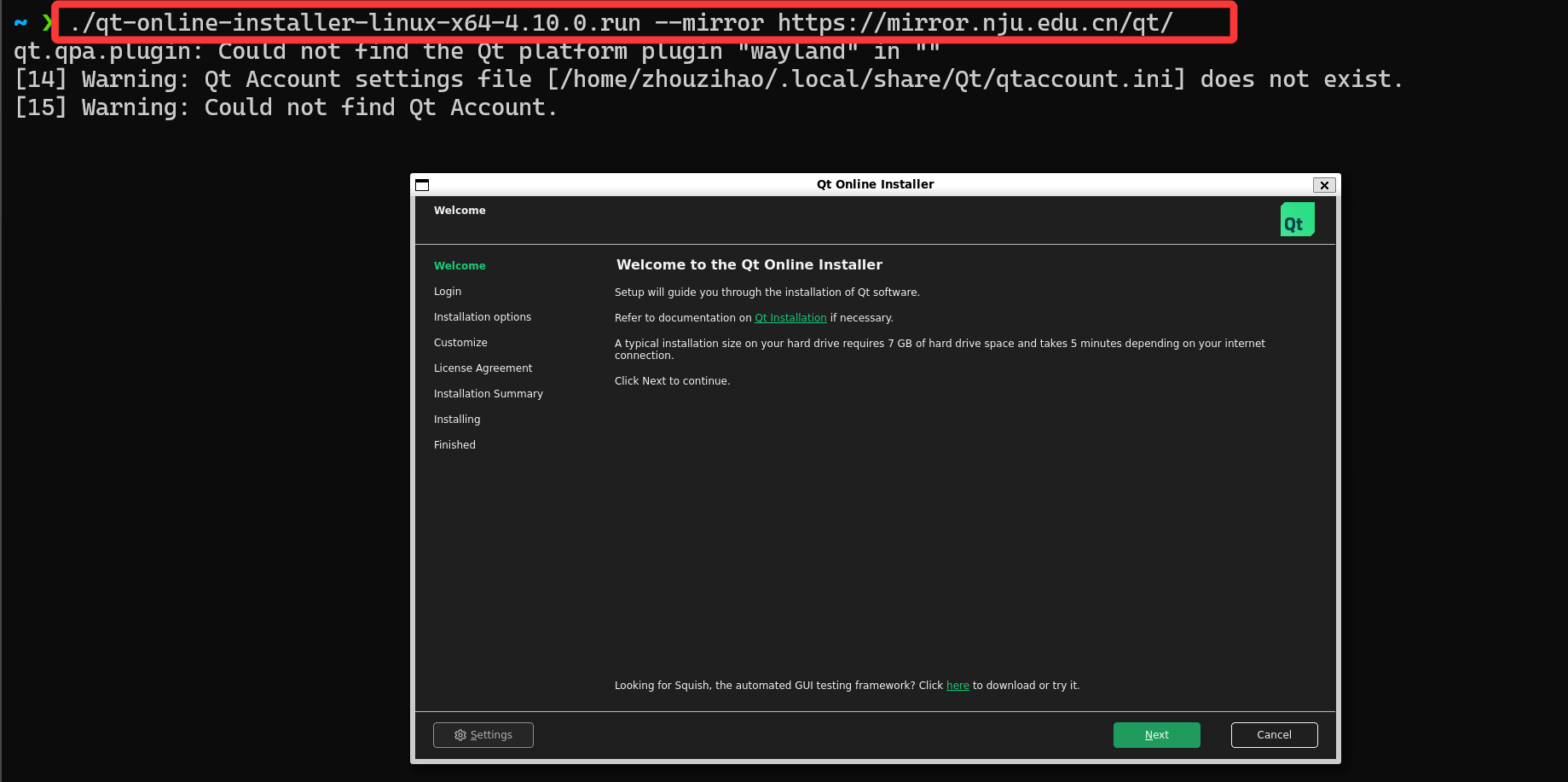 参考指令:./qt-online-installer-linux-x64-4.10.0.run --mirror https://mirror.nju.edu.cn/qt/